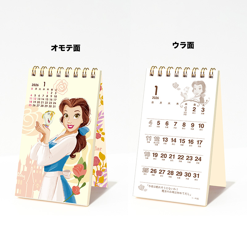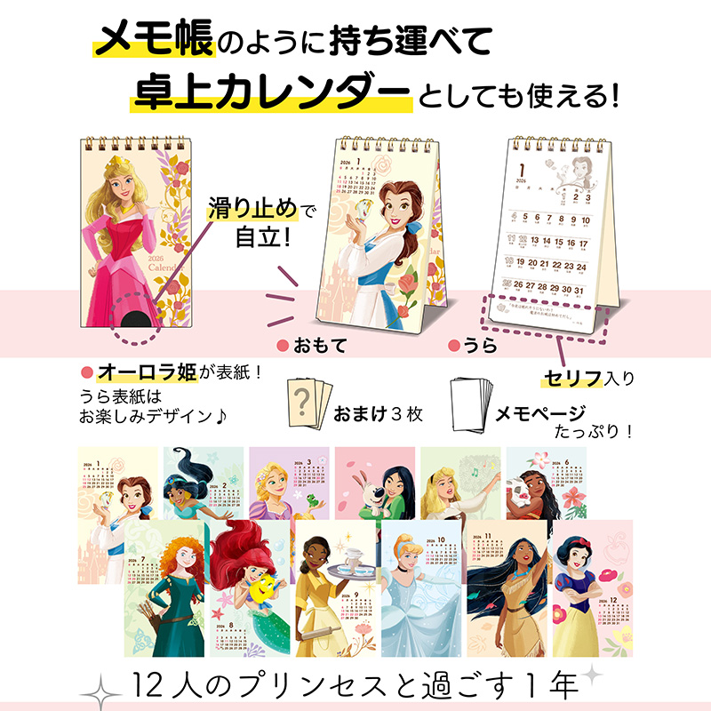 ポケットに収まるスマホサイズのコンパクトなディズニープリンセスのカレンダーです。表紙を飾るのはオーロラ姫で、カレンダーページでは12ヶ月毎月違ったプリンセスが楽しめます。おもて面のカレンダーは小さく、プリンセスを大きく楽しめ、うら面はカレンダーを大きく実用的に、プリンセスはワンポイントであしらっています。メモページがたくさんあるので、メモ帳としても便利な商品です。ポケットやカバンに入れて持ち運べば、お出かけ先でのスケジュール確認やメモ書きに使ったり、オフィスやお部屋のデスクで立てて使うことができます。(滑り止め付きで、デスクでもしっかり立ちます)