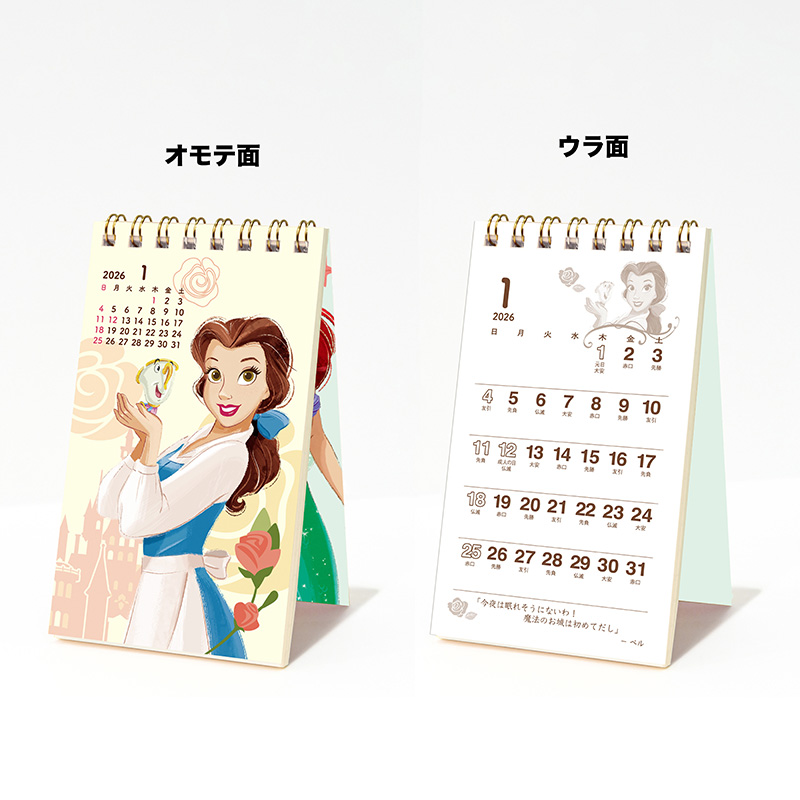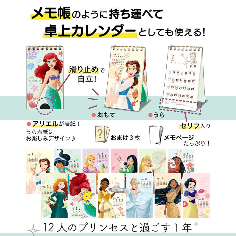 ポケットに収まるスマホサイズのコンパクトなディズニープリンセスのカレンダーです。表紙を飾るのはアリエルで、カレンダーページでは12ヶ月毎月違ったプリンセスが楽しめます。おもて面のカレンダーは小さく、プリンセスを大きく楽しめ、うら面はカレンダーを大きく実用的に、プリンセスはワンポイントであしらっています。メモページがたくさんあるので、メモ帳としても便利な商品です。ポケットやカバンに入れて持ち運べば、お出かけ先でのスケジュール確認やメモ書きに使ったり、オフィスやお部屋のデスクで立てて使うことができます。(滑り止め付きで、デスクでもしっかり立ちます)
