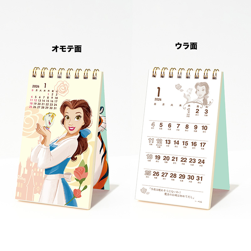 ポケットに収まるスマホサイズのコンパクトなディズニープリンセスのカレンダーです。表紙を飾るのはジャスミンで、カレンダーページでは12ヶ月毎月違ったプリンセスが楽しめます。おもて面のカレンダーは小さく、プリンセスを大きく楽しめ、うら面はカレンダーを大きく実用的に、プリンセスはワンポイントであしらっています。メモページがたくさんあるので、メモ帳としても便利な商品です。ポケットやカバンに入れて持ち運べば、お出かけ先でのスケジュール確認やメモ書きに使ったり、オフィスやお部屋のデスクで立てて使うことができます。(滑り止め付きで、デスクでもしっかり立ちます)