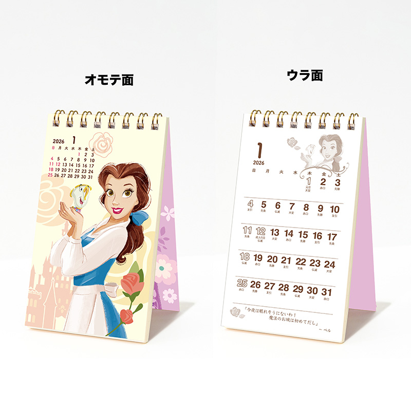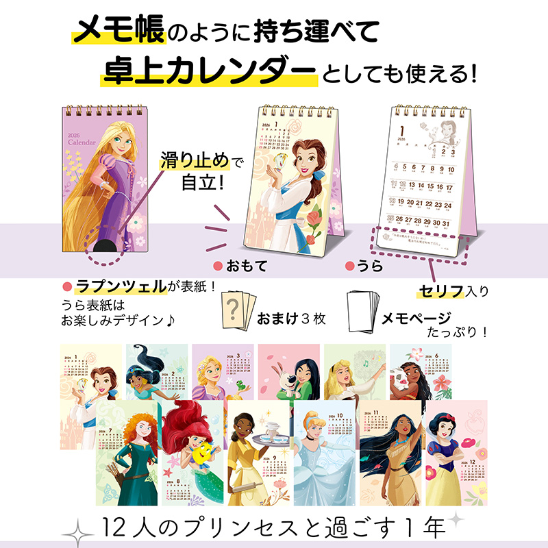 ポケットに収まるスマホサイズのコンパクトなディズニープリンセスのカレンダーです。表紙を飾るのはラプンツェルで、カレンダーページでは12ヶ月毎月違ったプリンセスが楽しめます。おもて面のカレンダーは小さく、プリンセスを大きく楽しめ、うら面はカレンダーを大きく実用的に、プリンセスはワンポイントであしらっています。メモページがたくさんあるので、メモ帳としても便利な商品です。ポケットやカバンに入れて持ち運べば、お出かけ先でのスケジュール確認やメモ書きに使ったり、オフィスやお部屋のデスクで立てて使うことができます。(滑り止め付きで、デスクでもしっかり立ちます)