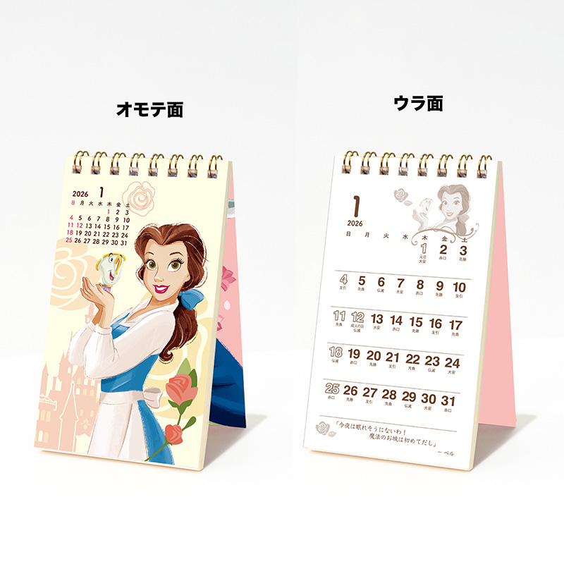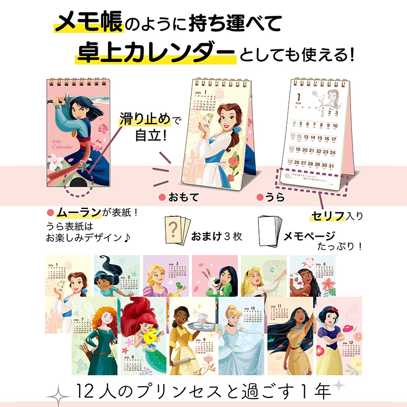 ポケットに収まるスマホサイズのコンパクトなディズニープリンセスのカレンダーです。表紙を飾るのはムーランで、カレンダーページでは12ヶ月毎月違ったプリンセスが楽しめます。おもて面のカレンダーは小さく、プリンセスを大きく楽しめ、うら面はカレンダーを大きく実用的に、プリンセスはワンポイントであしらっています。メモページがたくさんあるので、メモ帳としても便利な商品です。ポケットやカバンに入れて持ち運べば、お出かけ先でのスケジュール確認やメモ書きに使ったり、オフィスやお部屋のデスクで立てて使うことができます。(滑り止め付きで、デスクでもしっかり立ちます)